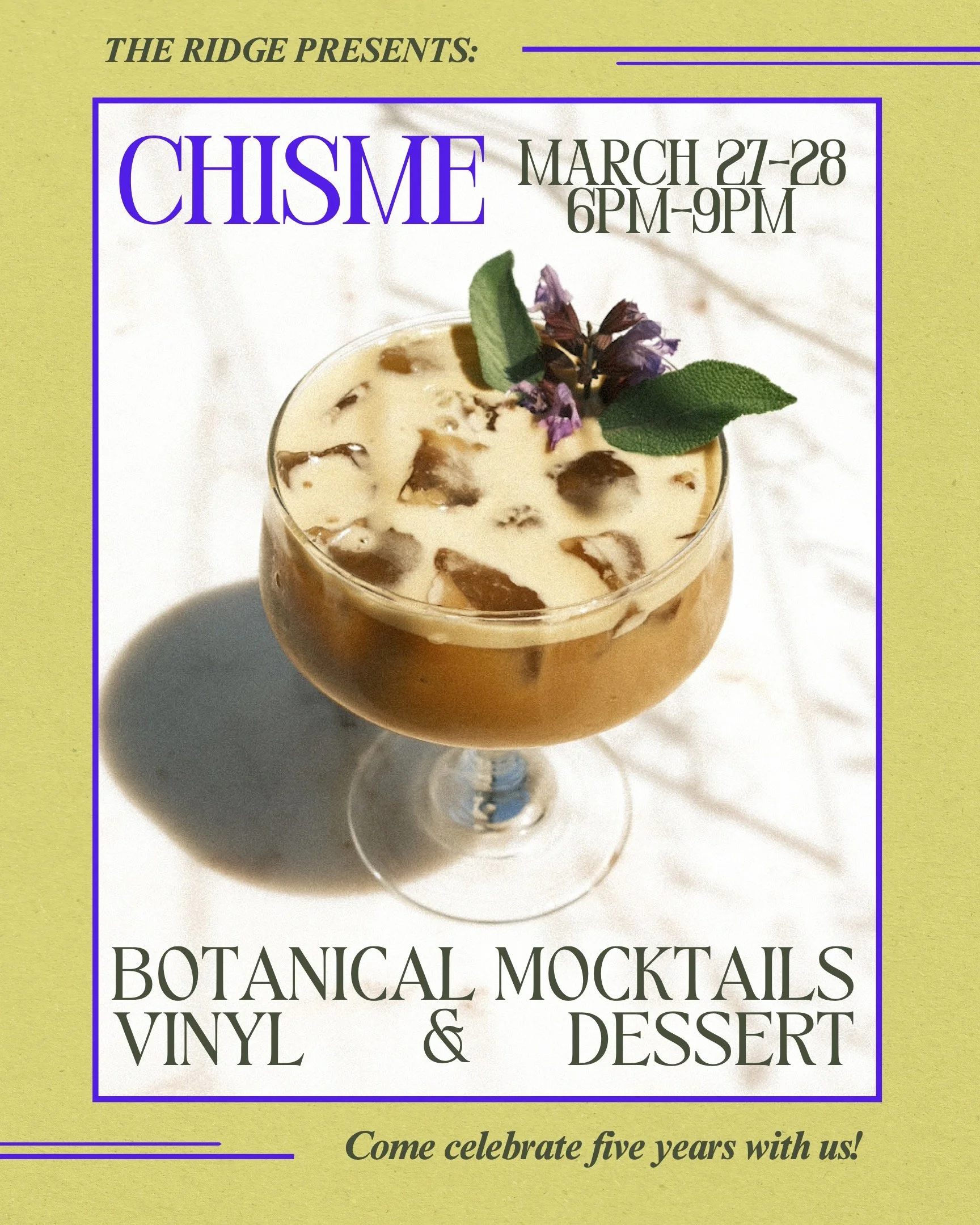 We are celebrating by introducing our new nighttime vibe: Chisme! Come from 6pm-9pm on March 27th + 28th where we will be serving botanical mocktails + dessert by some of the best bakeries in the Hudson Valley. Hope to see you there!